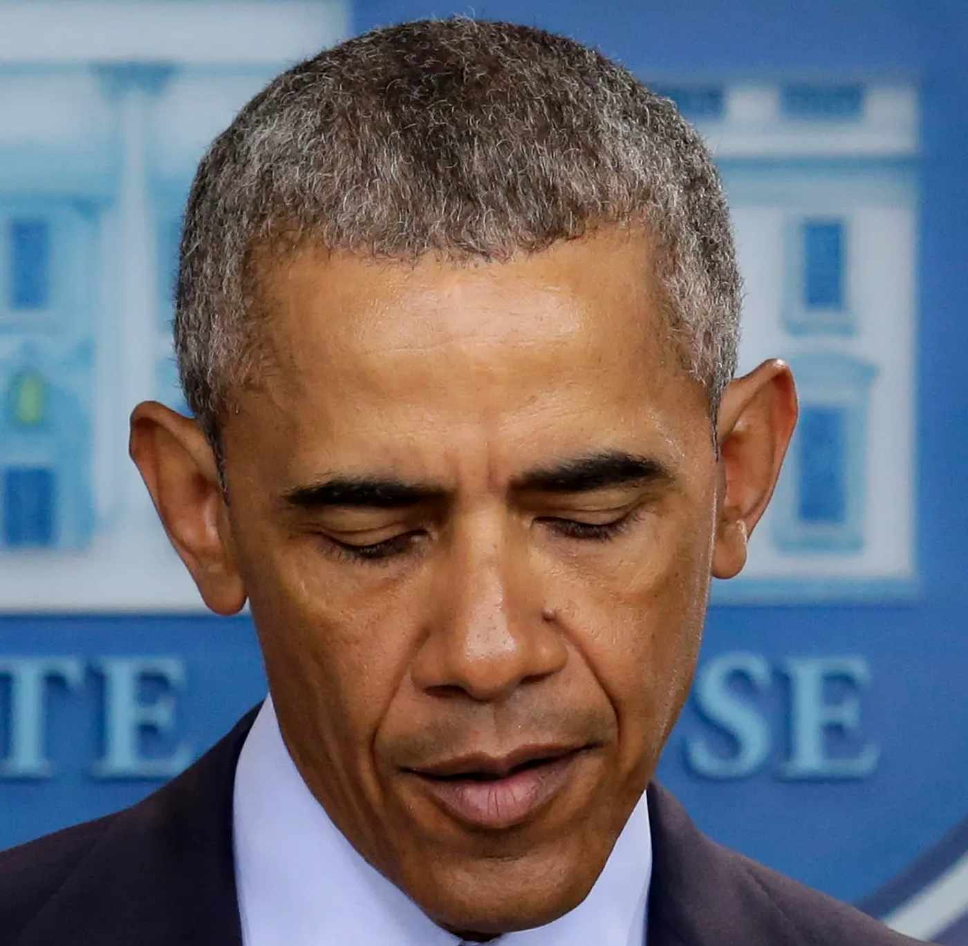 former President Barack Obama looking down with eyes closed at a White House press