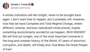 President Trump warned that a “whole civilization will die” on Tuesday night if Iran does