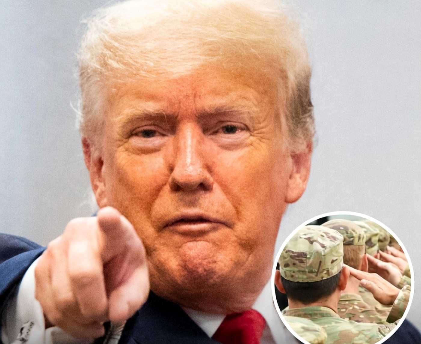 donald Trump pointing forward with military personnel saluting in inset